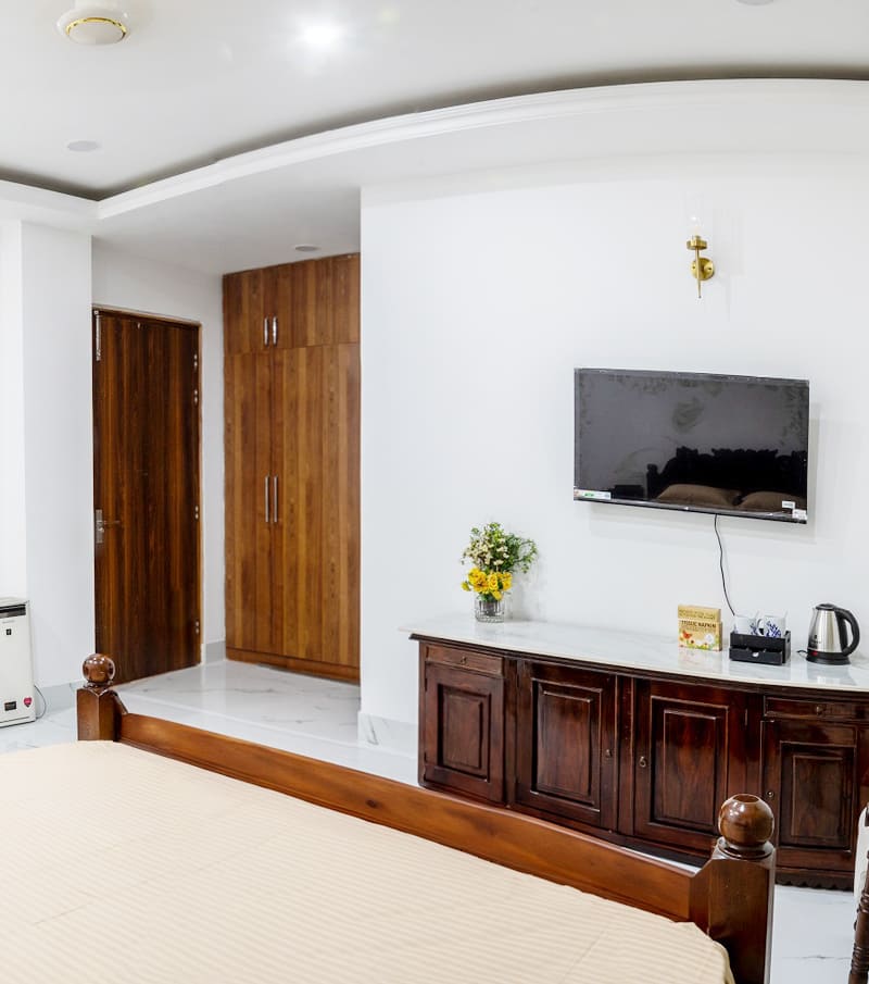 Relax and unwind in our spacious and elegantly furnished Master Bedroom, featuring a comfortable bed, attached bathroom, and serene ambiance for a restful stay.